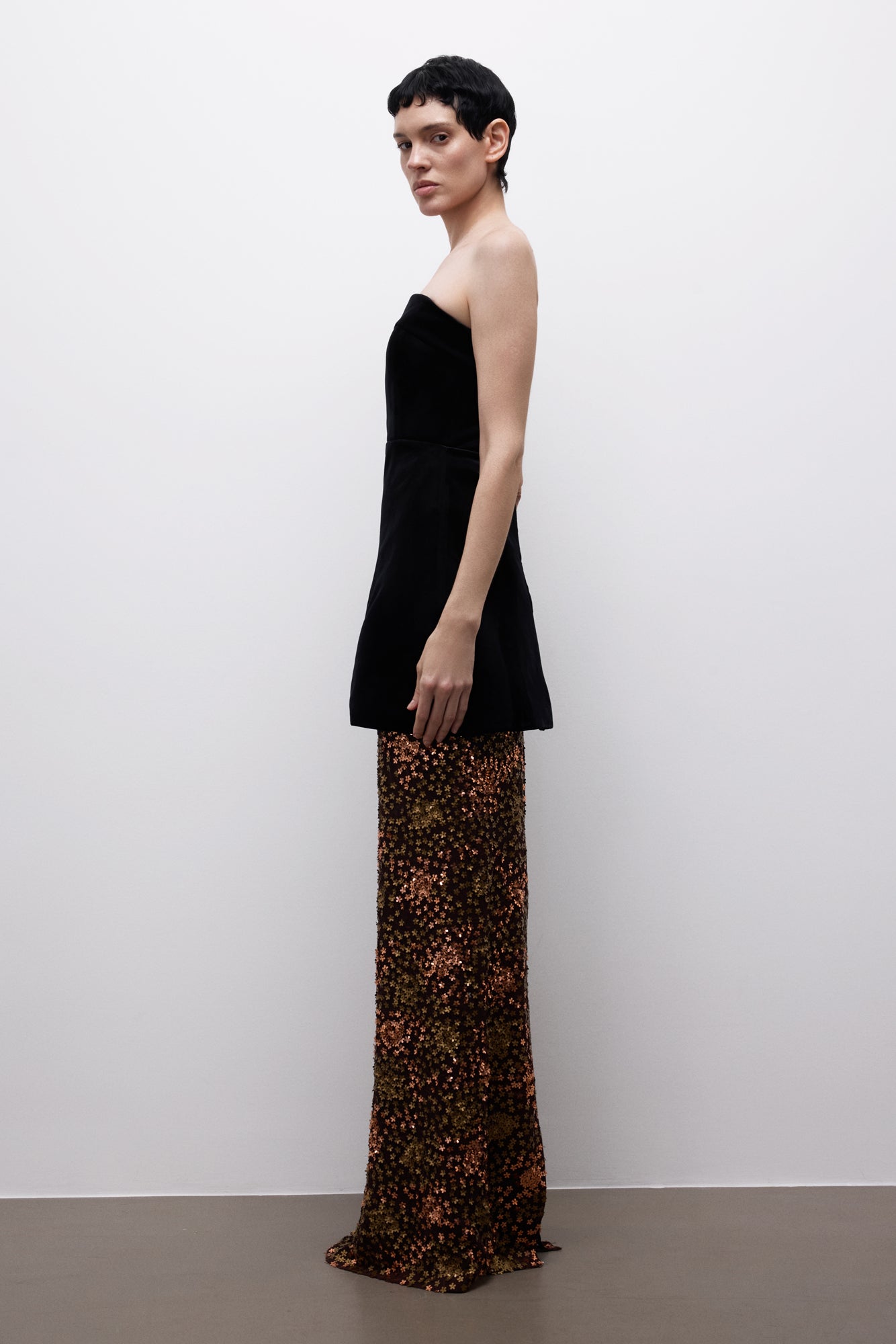 Aurex Noctis Dress balances simplicity with shimmer in a strong silhouette. The strapless, minimal bodice brings a sculptural stance, while the sequin-textured skirt adds depth and controlled grandeur. Designed for those who want impact without showiness.