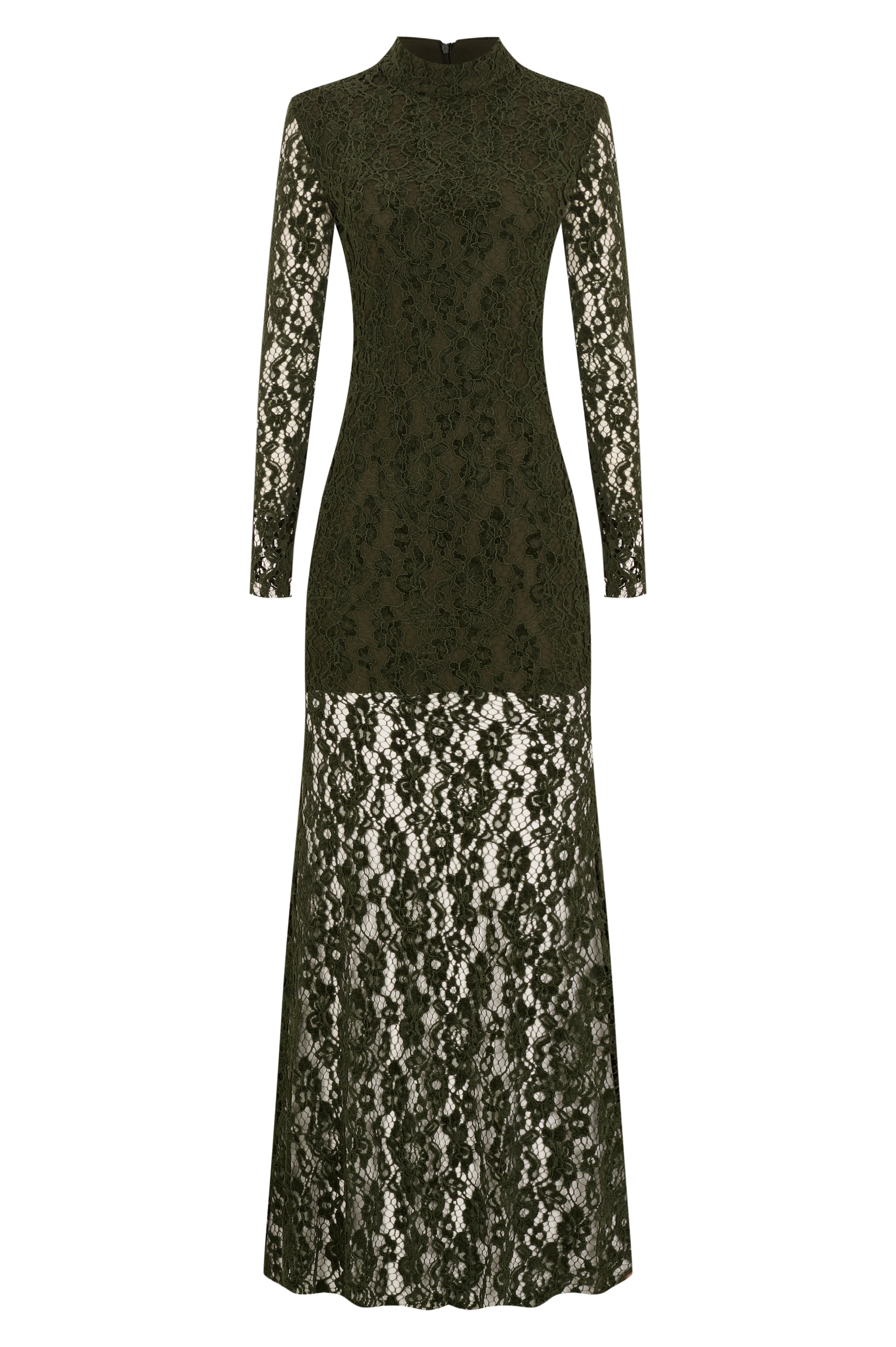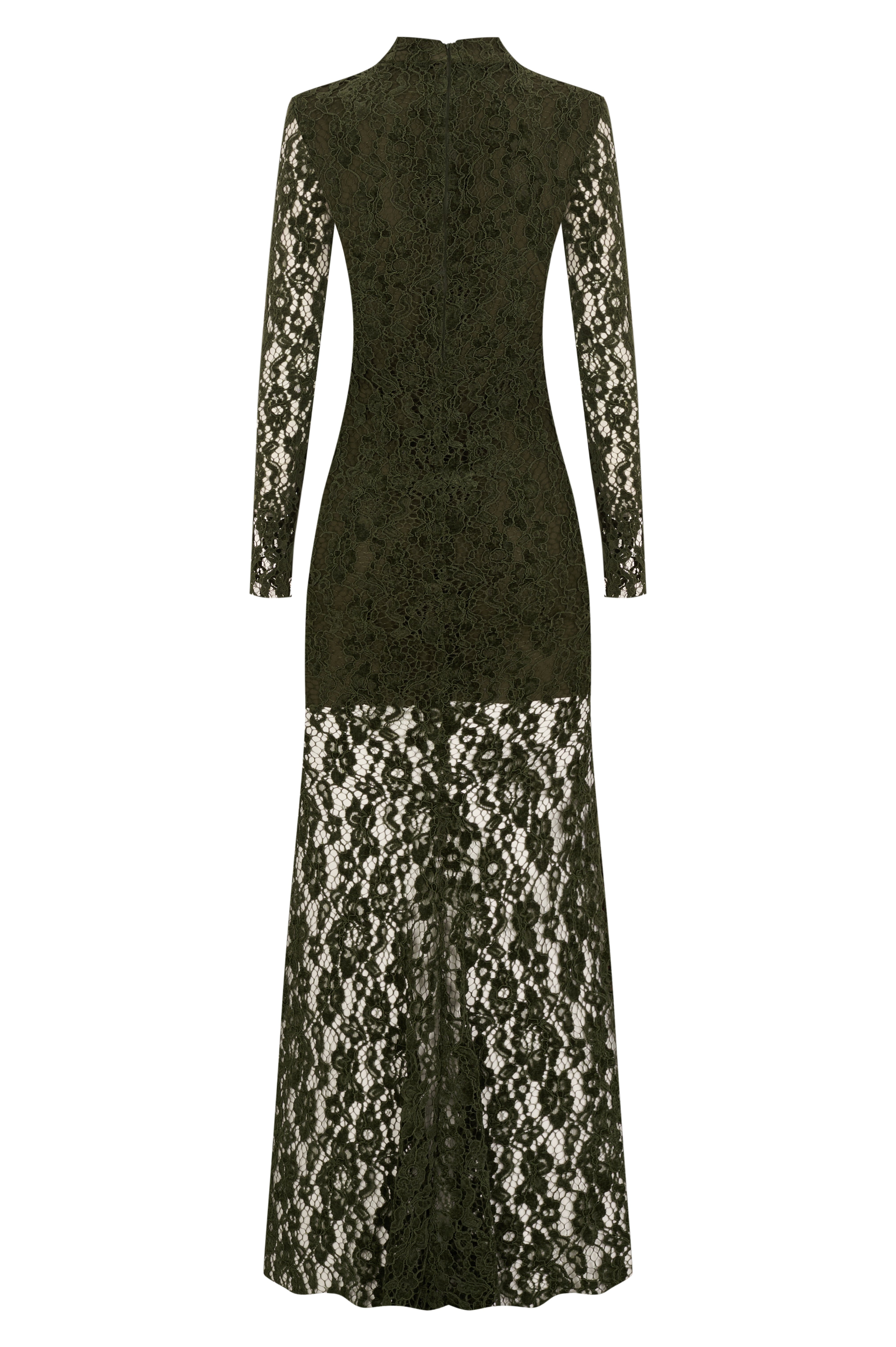 The Forest Lace Maxi Dress offers sophisticated elegance with its full lace texture and long-sleeve silhouette. The semi-sheer lower skirt and fitted shape add a romantic and elevated appeal.