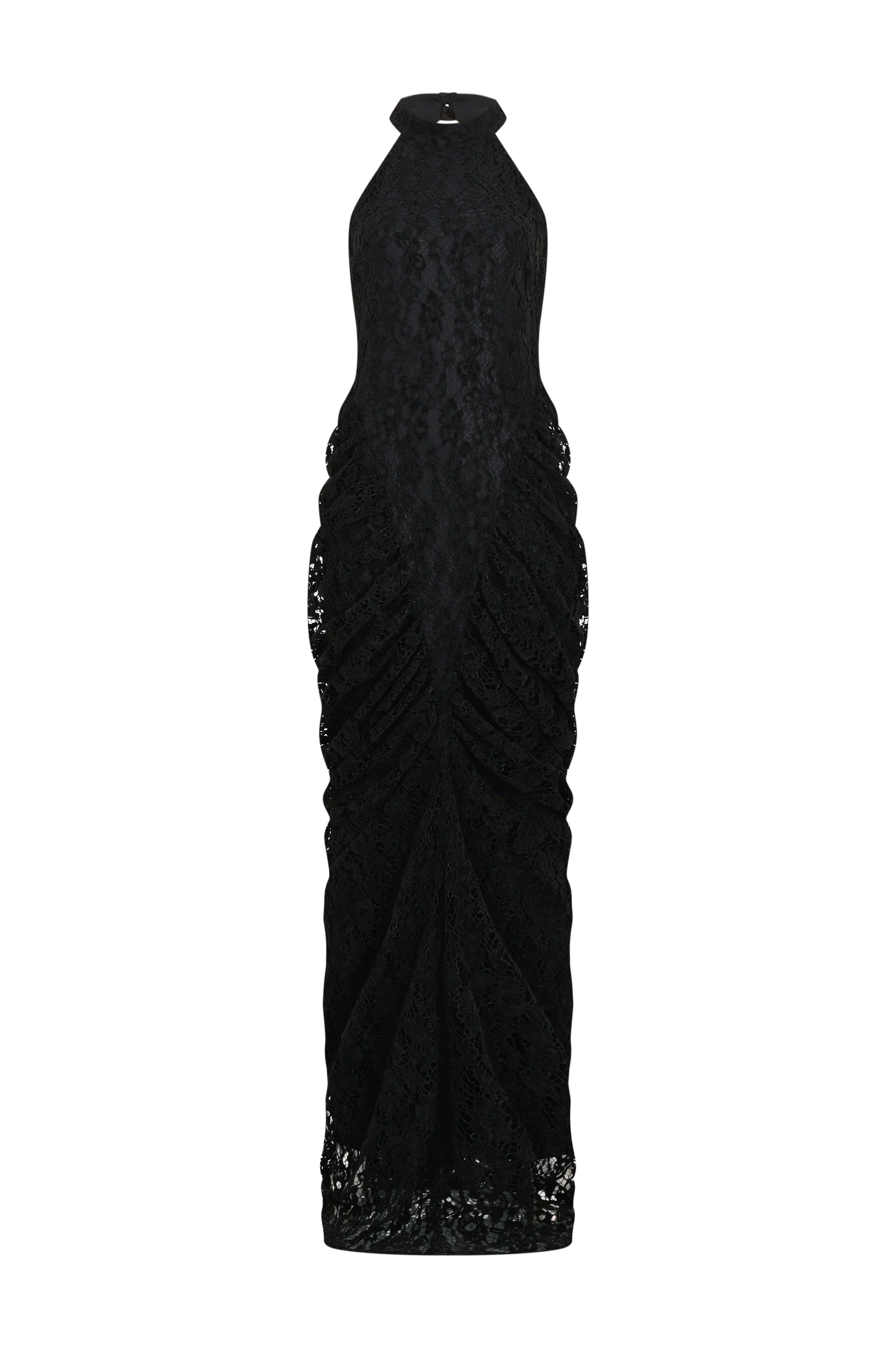 Lunar Eclipse Dress offers a powerful and sophisticated look with its black lace texture and draped silhouette. The halter neckline, sleeveless design, and deep back detail create a modern elegance, while its maxi length highlights refined sophistication for special occasions.