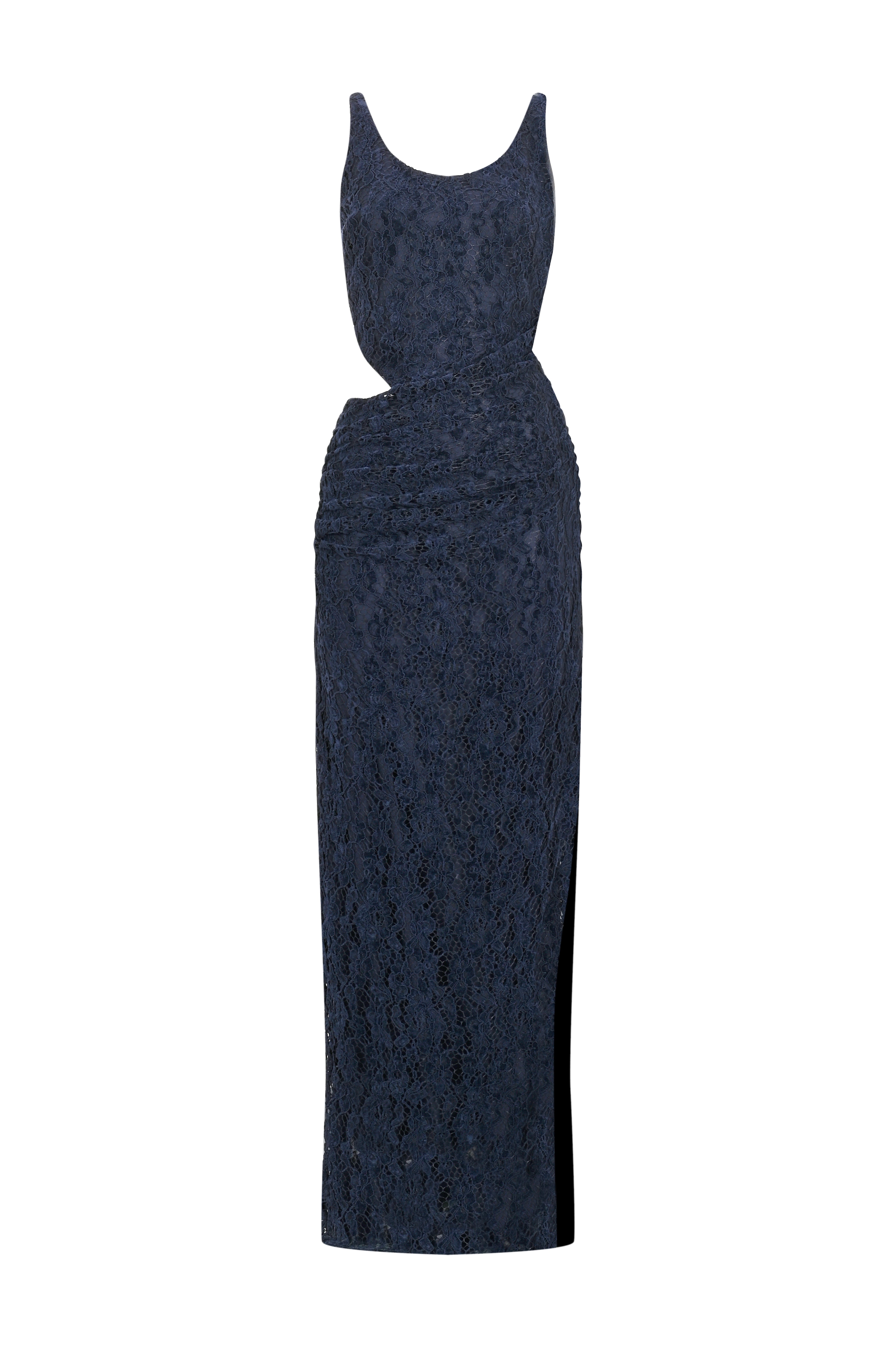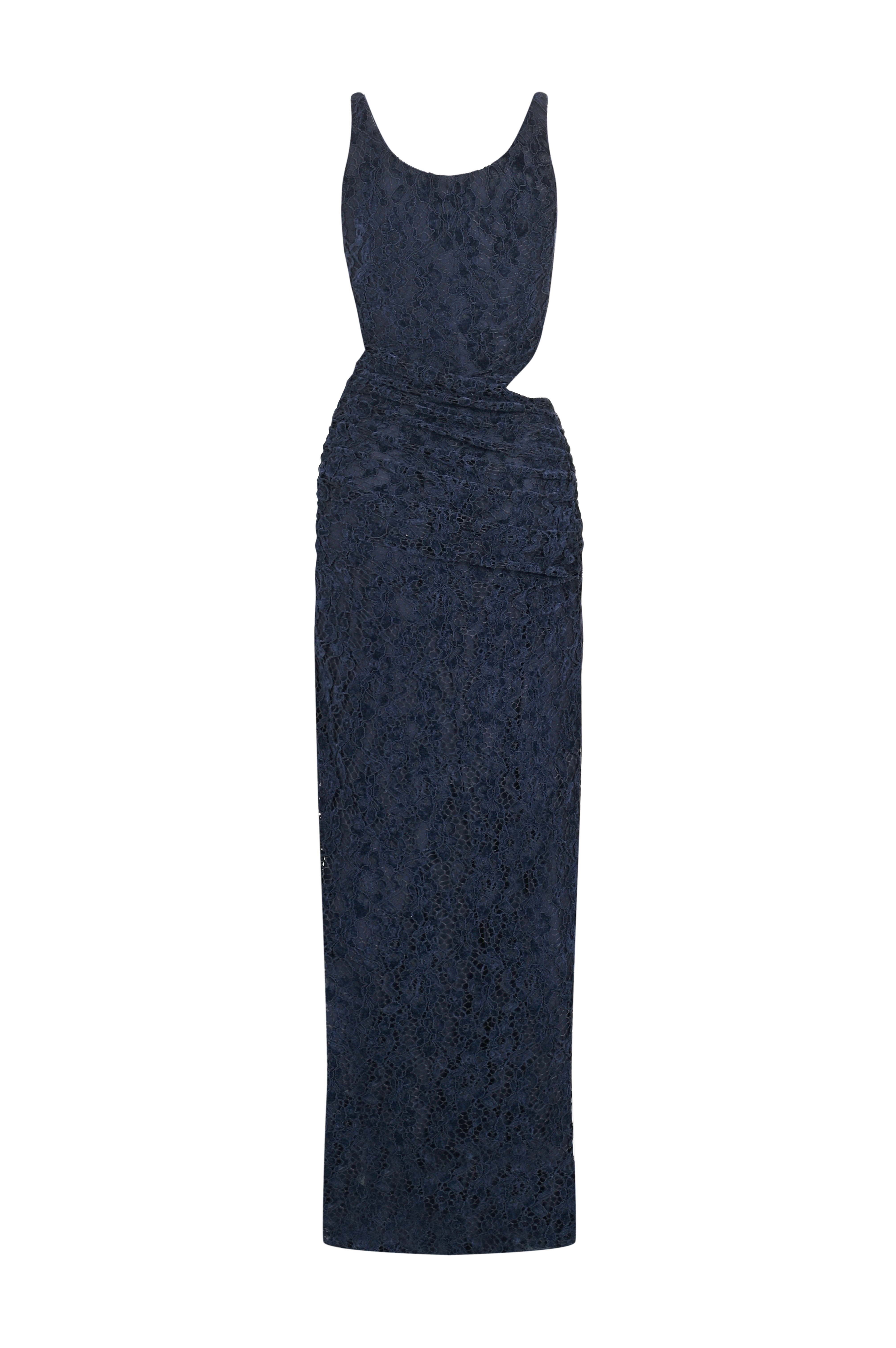 Midnight Mirage Dress offers a strong and modern silhouette with its navy lace texture and asymmetrical waist detail. The draped skirt and maxi length create refined elegance, while the wide straps provide both style and balance. A striking choice for special occasions and evening events.