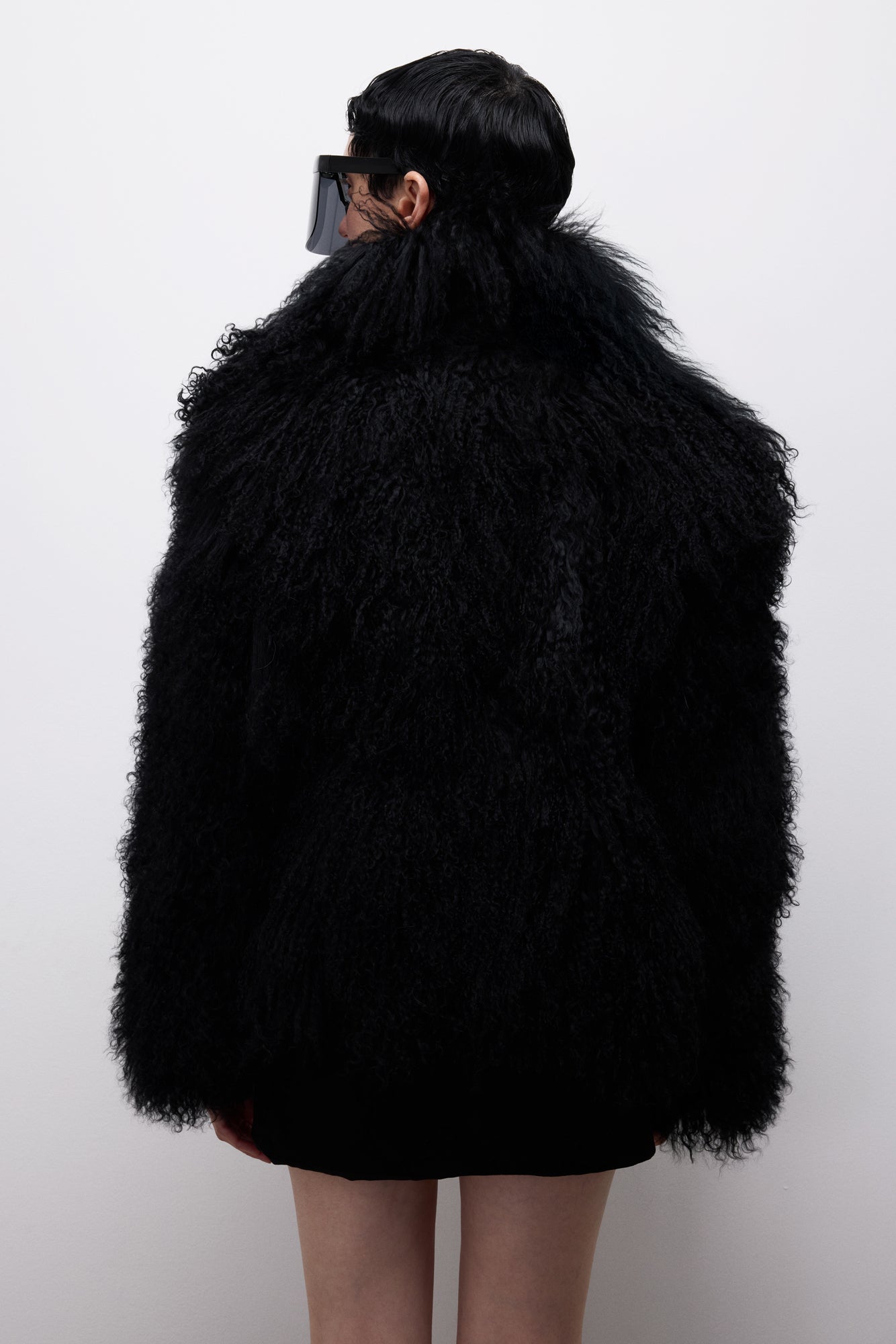 Noctis Shearling Cape was conceived as a silhouette that quietly carries strength within darkness. With its high-collared form and sculptural volume, it protects the body rather than merely enveloping it; its presence is not proclaimed, but deeply felt.