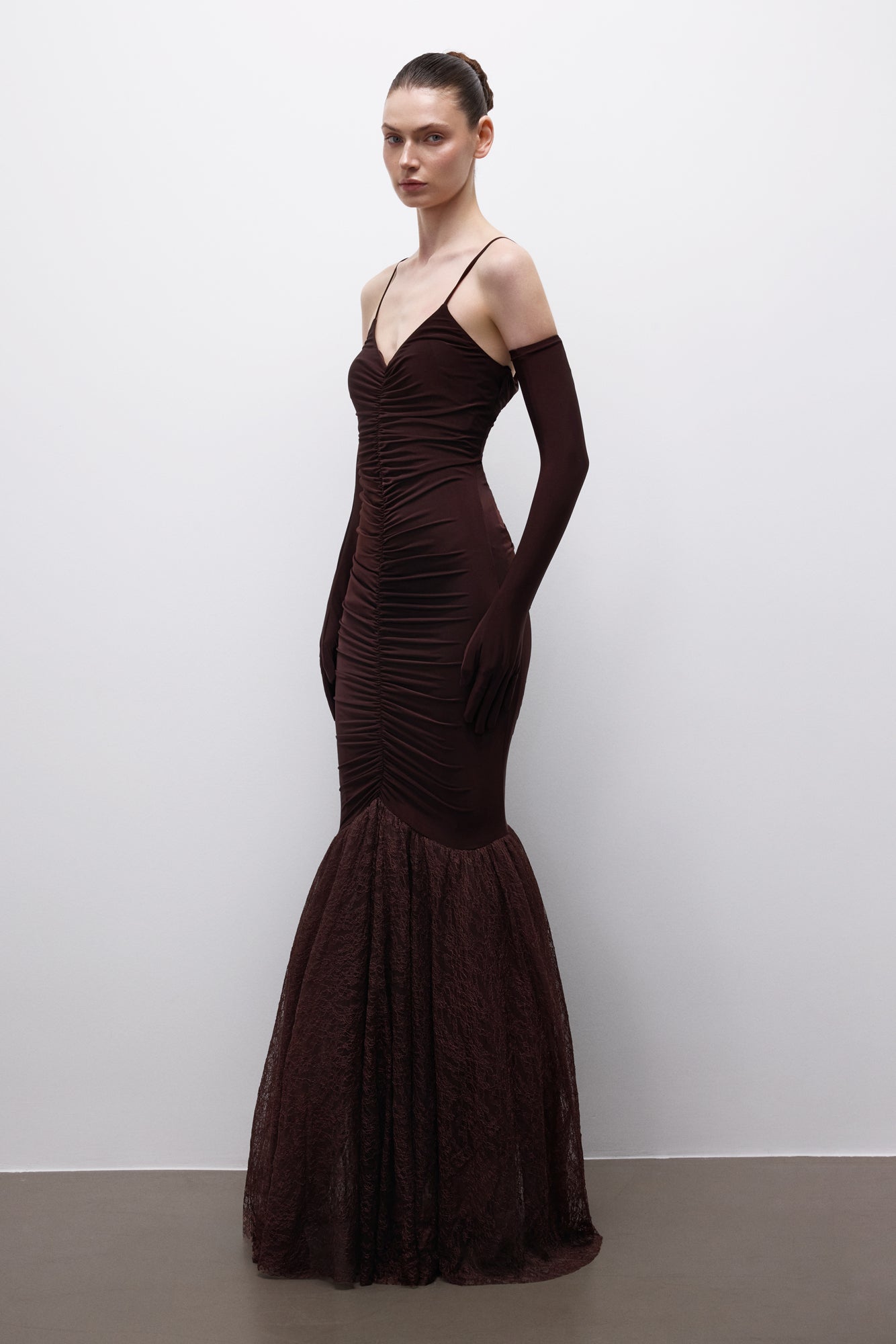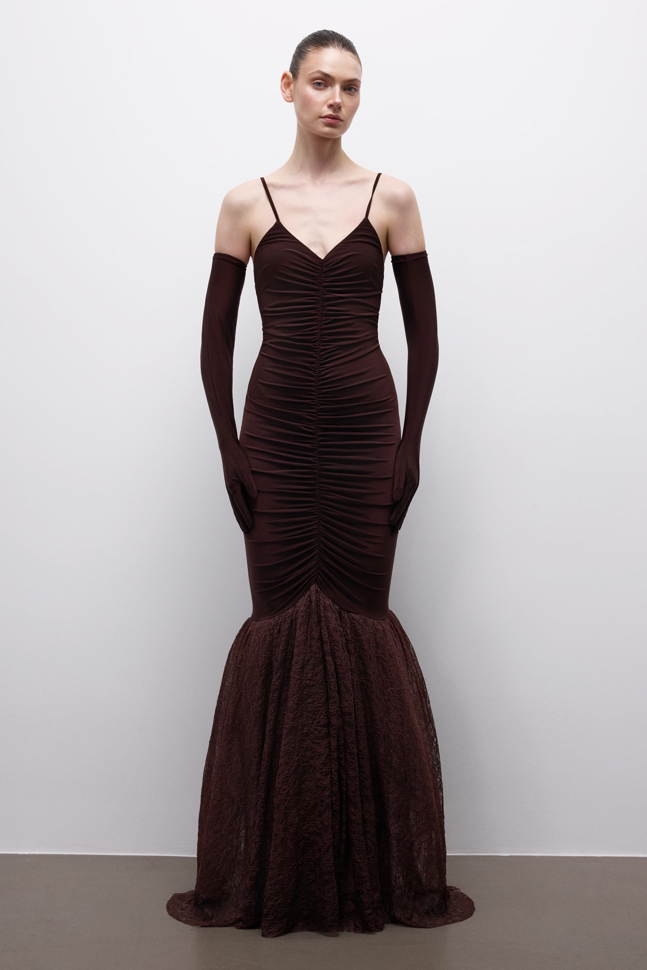 A feminine silhouette with a ruched body and a soft mermaid-style hem.
