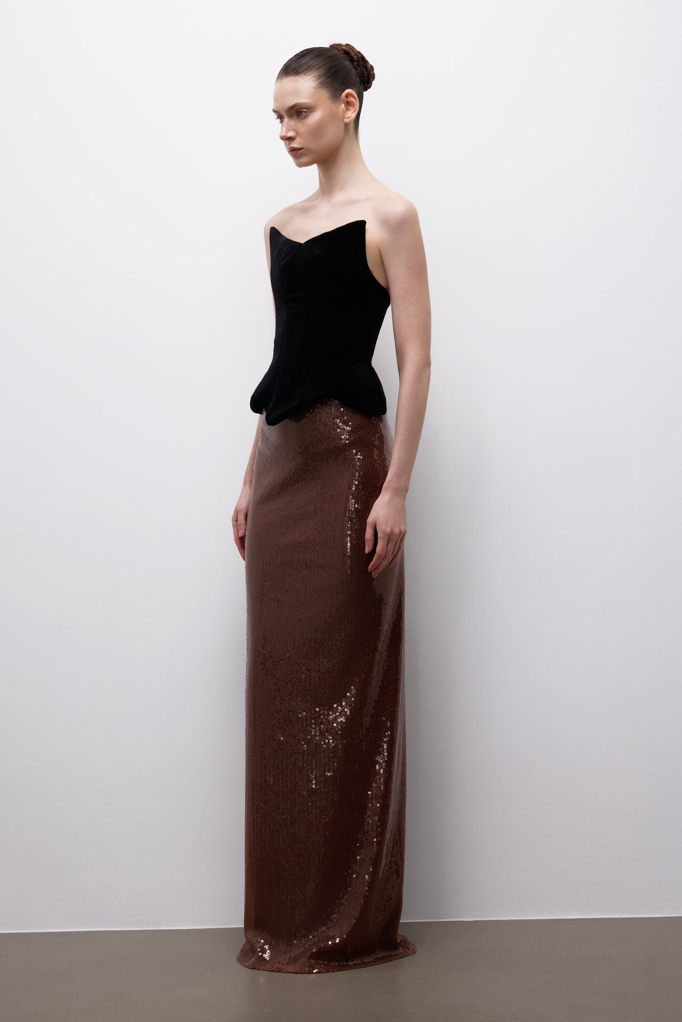 Noctyra Form Dress brings together the bold contrast of an architectural bodice and fluid texture. The strapless, structured black bodice wraps the body with clean lines, while the bronze sequin skirt falls to the floor in a controlled flow—creating a modern, assertive evening silhouette for those who want strength with restraint.