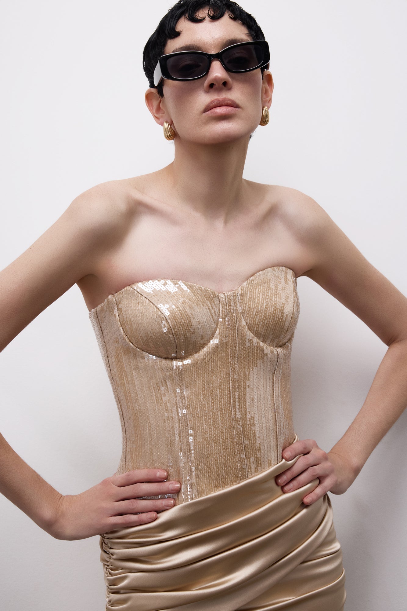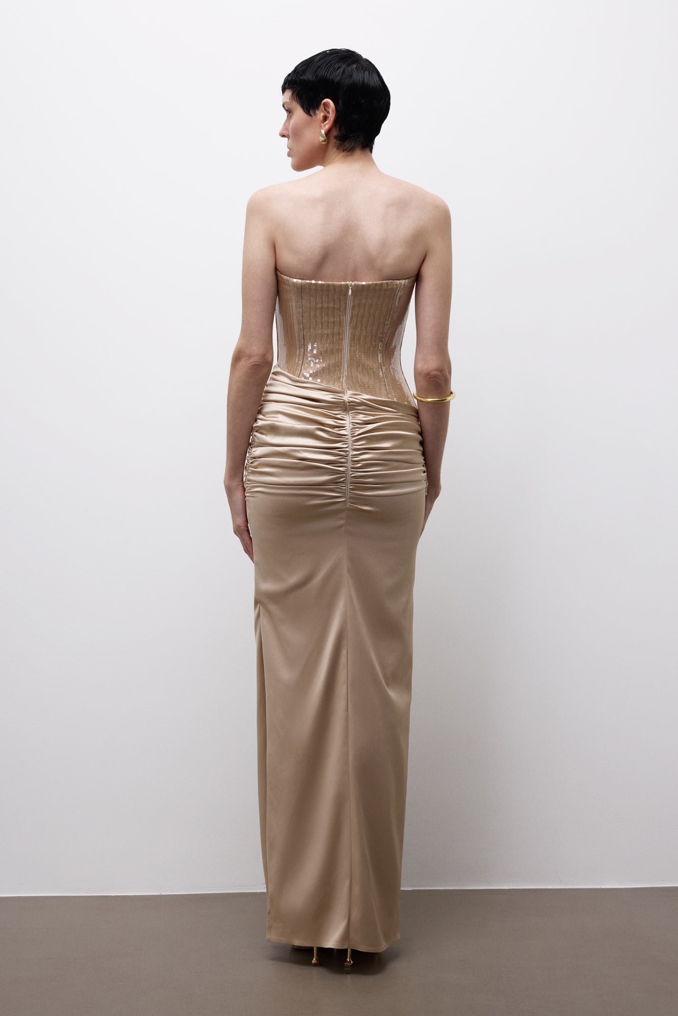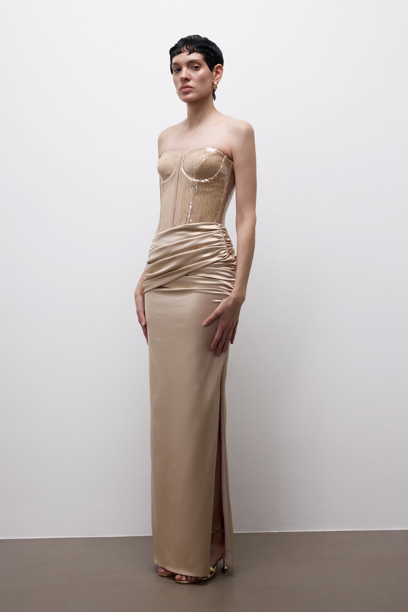 Born from the quiet power of night, this design represents ascent through understated grandeur. A sculptural corseted bodice and fluid skirt create a timeless, ceremonial silhouette.