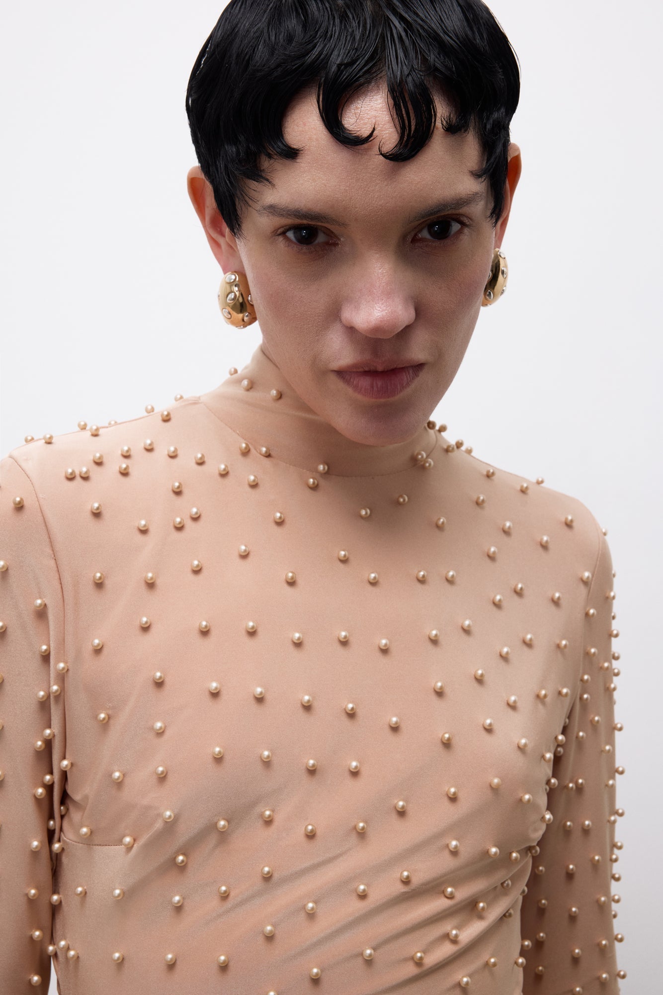 A high neckline and long sleeves, paired with a pearl-textured surface, create a simple yet powerful presence.