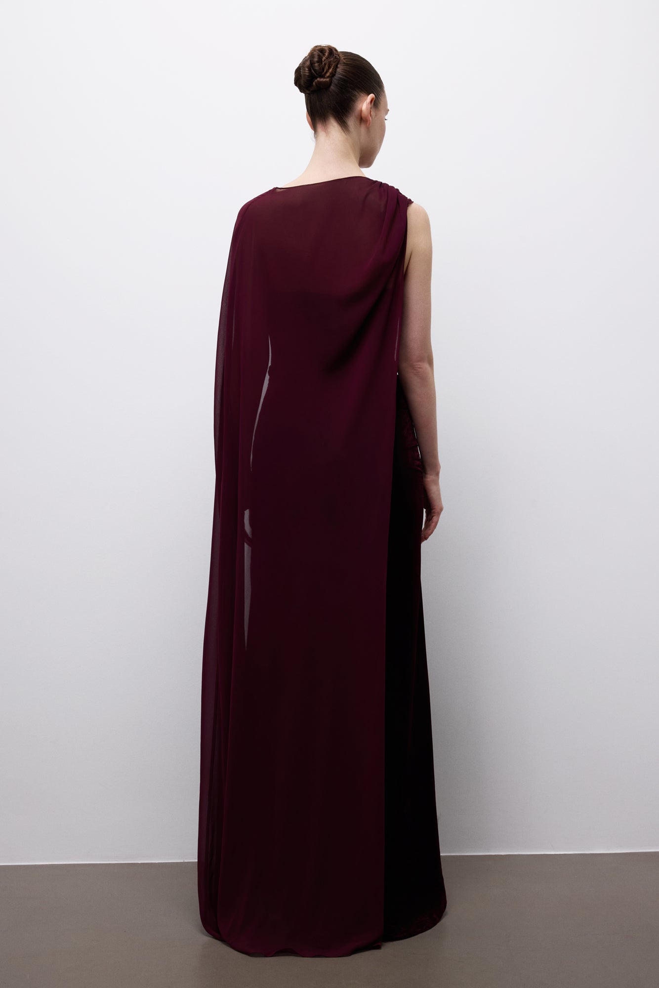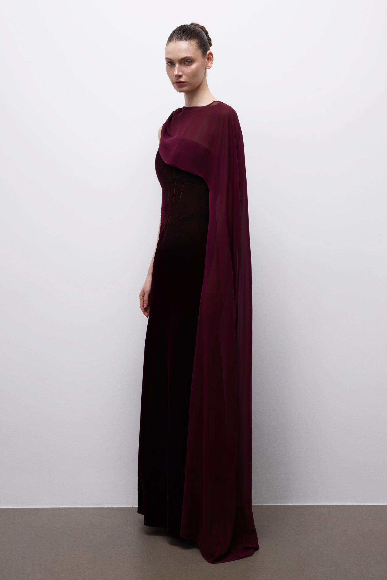 Born from the myth of night and an ancient vow, Nyxfall Covenant Dress carries quiet strength and ceremonial elegance. Its sculptural strapless form softens with a flowing cape, offering a modern goddess silhouette that follows destiny, not time.