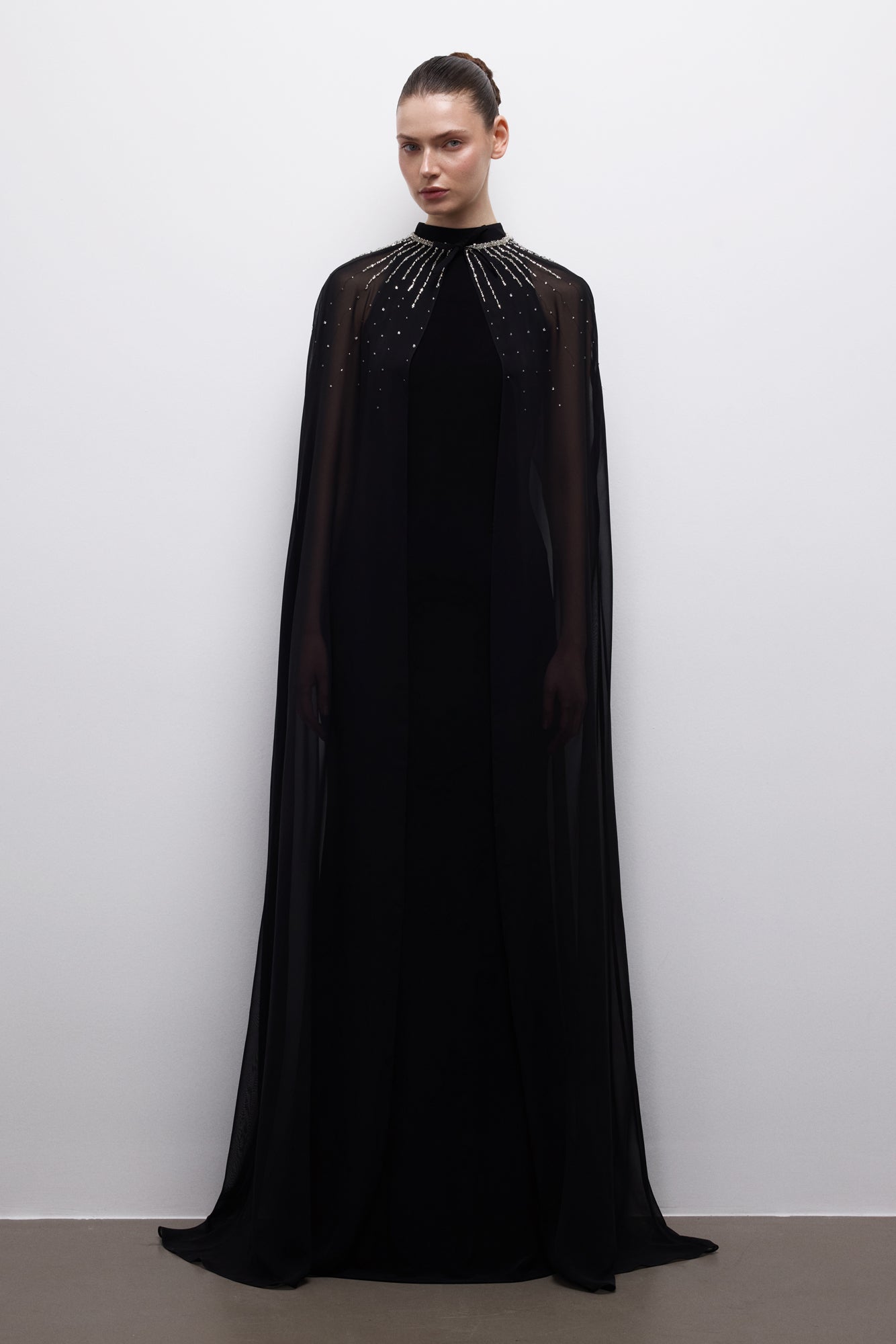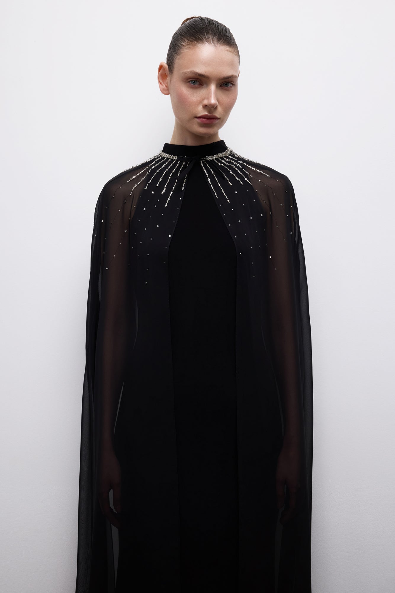 A fluid, strong silhouette with a sheer cape detail and light-catching neckline embellishment.
