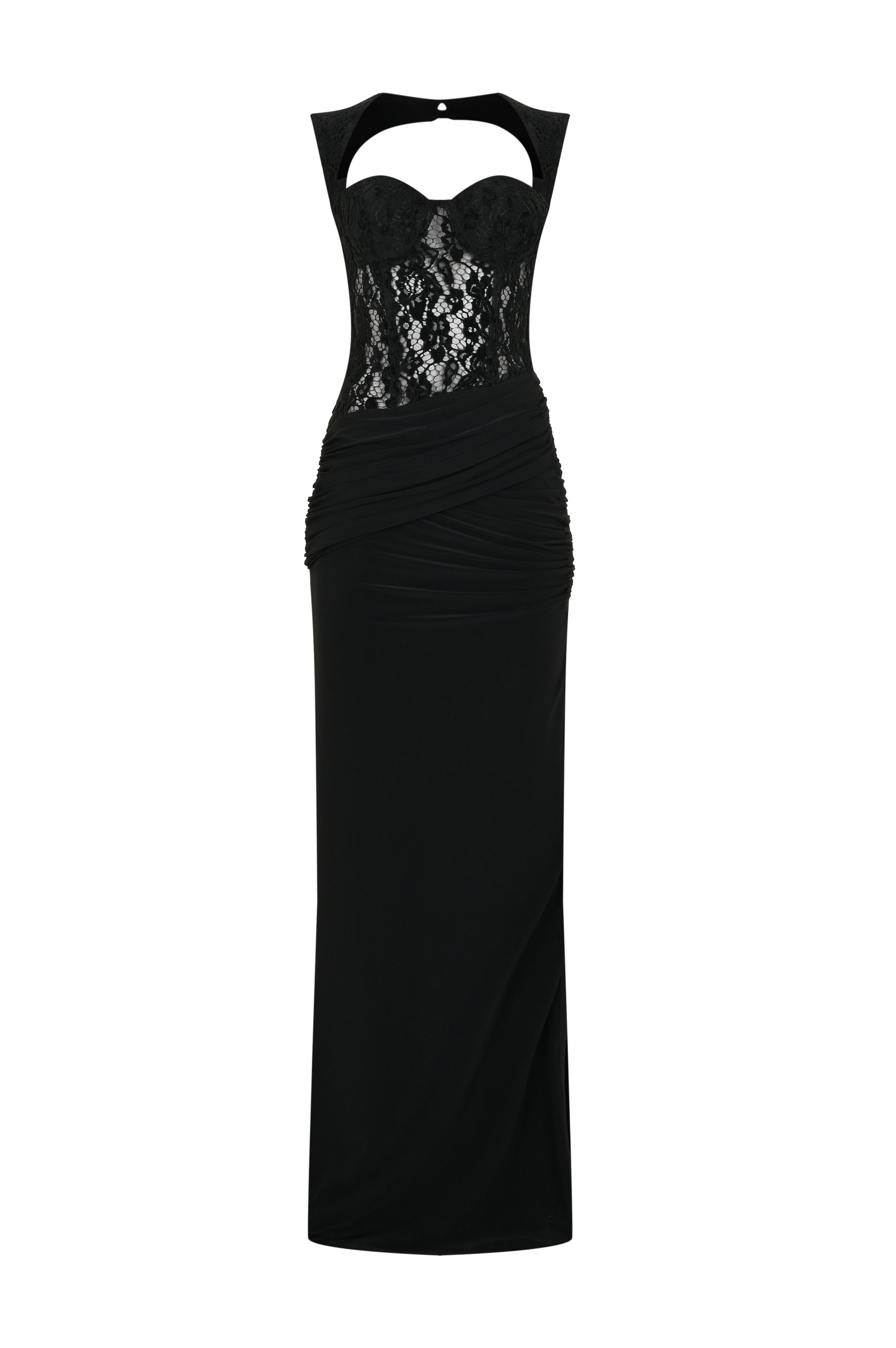 Obsidian Noir Dress creates a strong and feminine silhouette with its lace bust design and draped skirt. The supportive bust structure and open-shoulder detail deliver a modern, confident look, while its maxi length adds striking elegance to any special occasion.