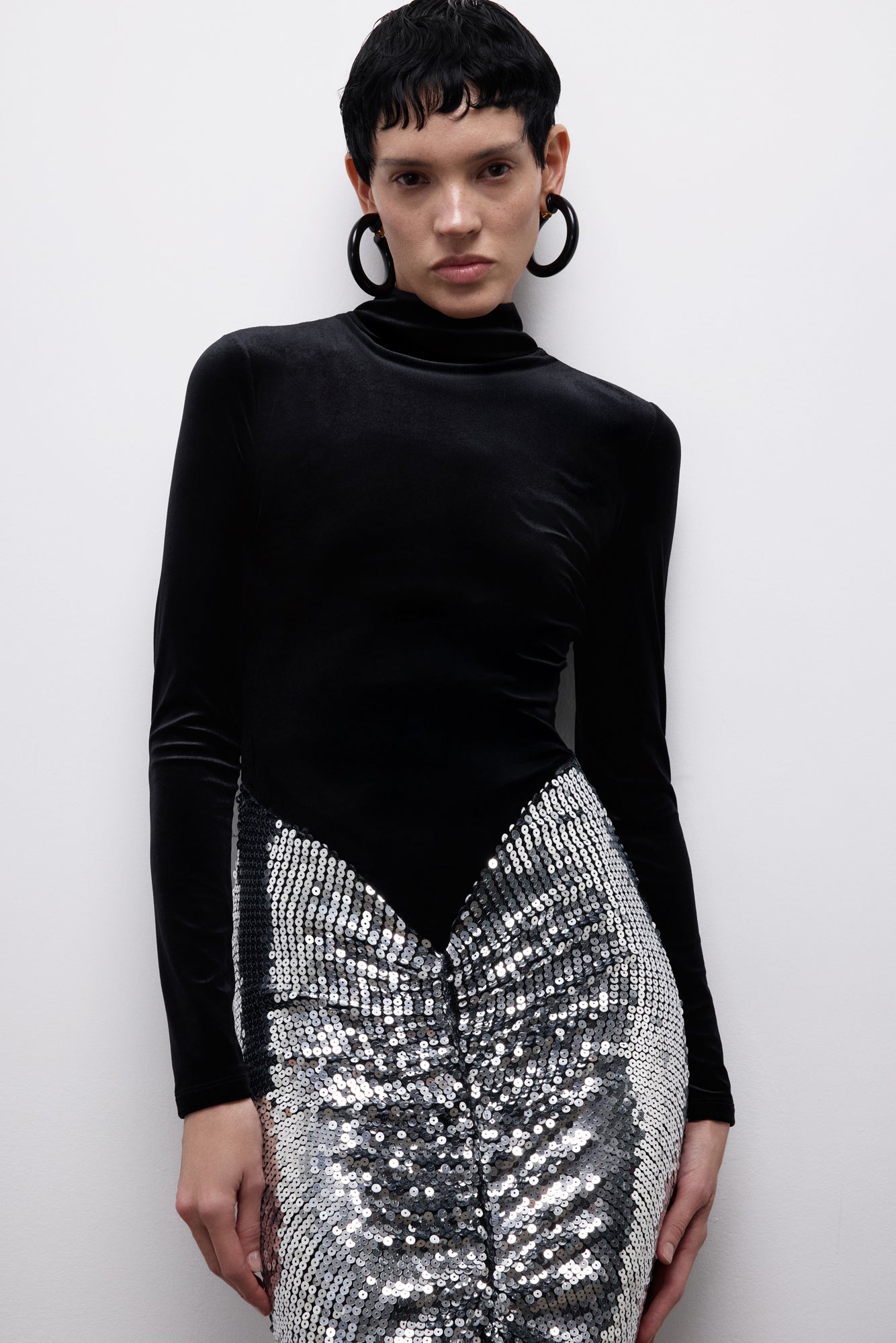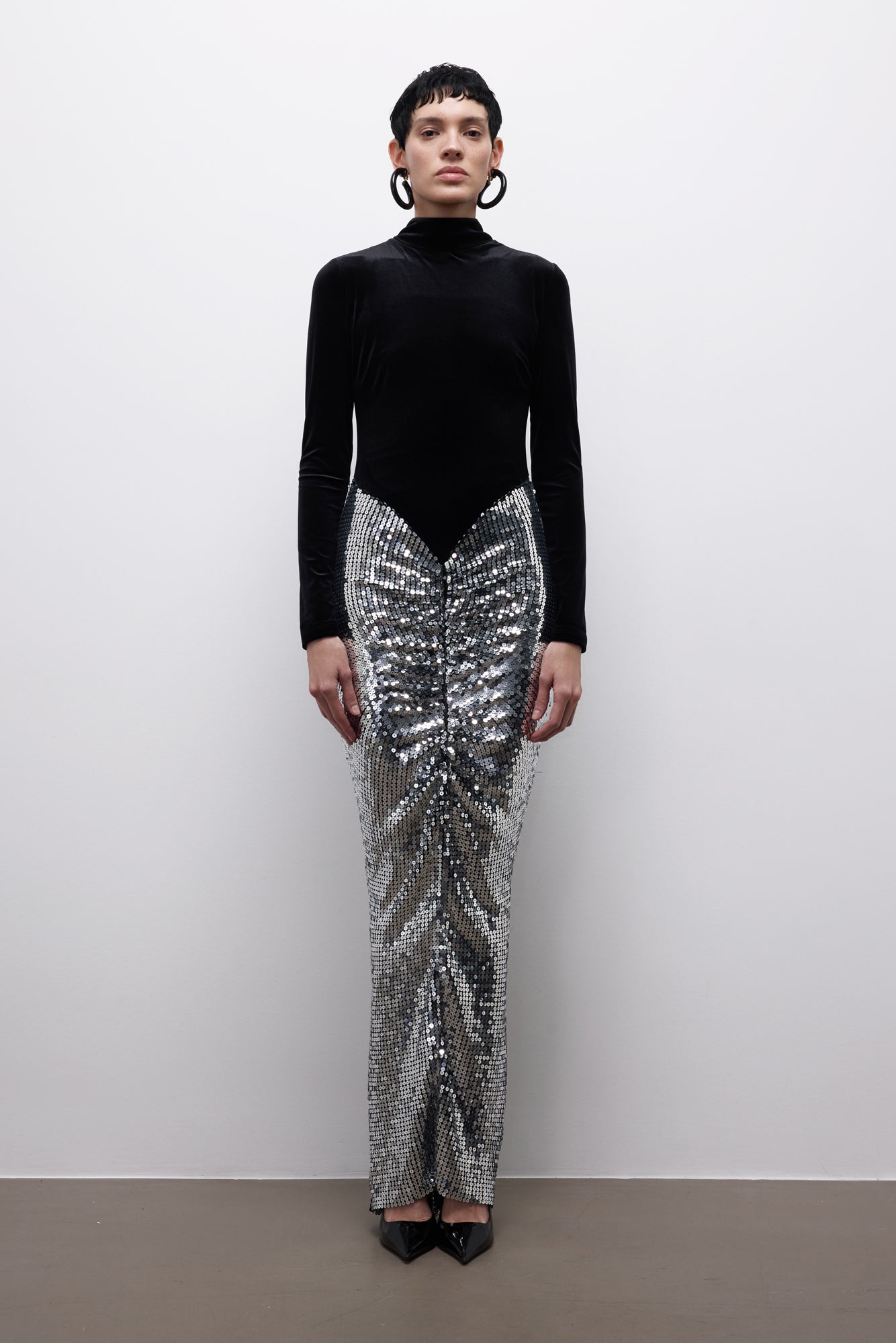 Its long-sleeve, high-neck design creates a bold contrast with the sequin skirt.