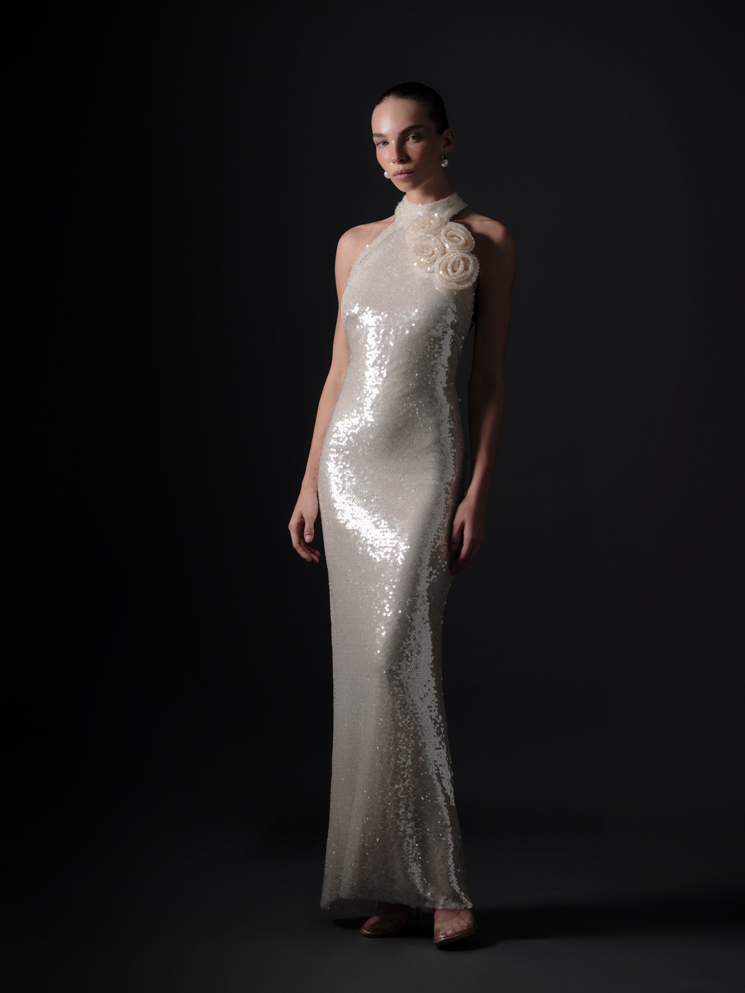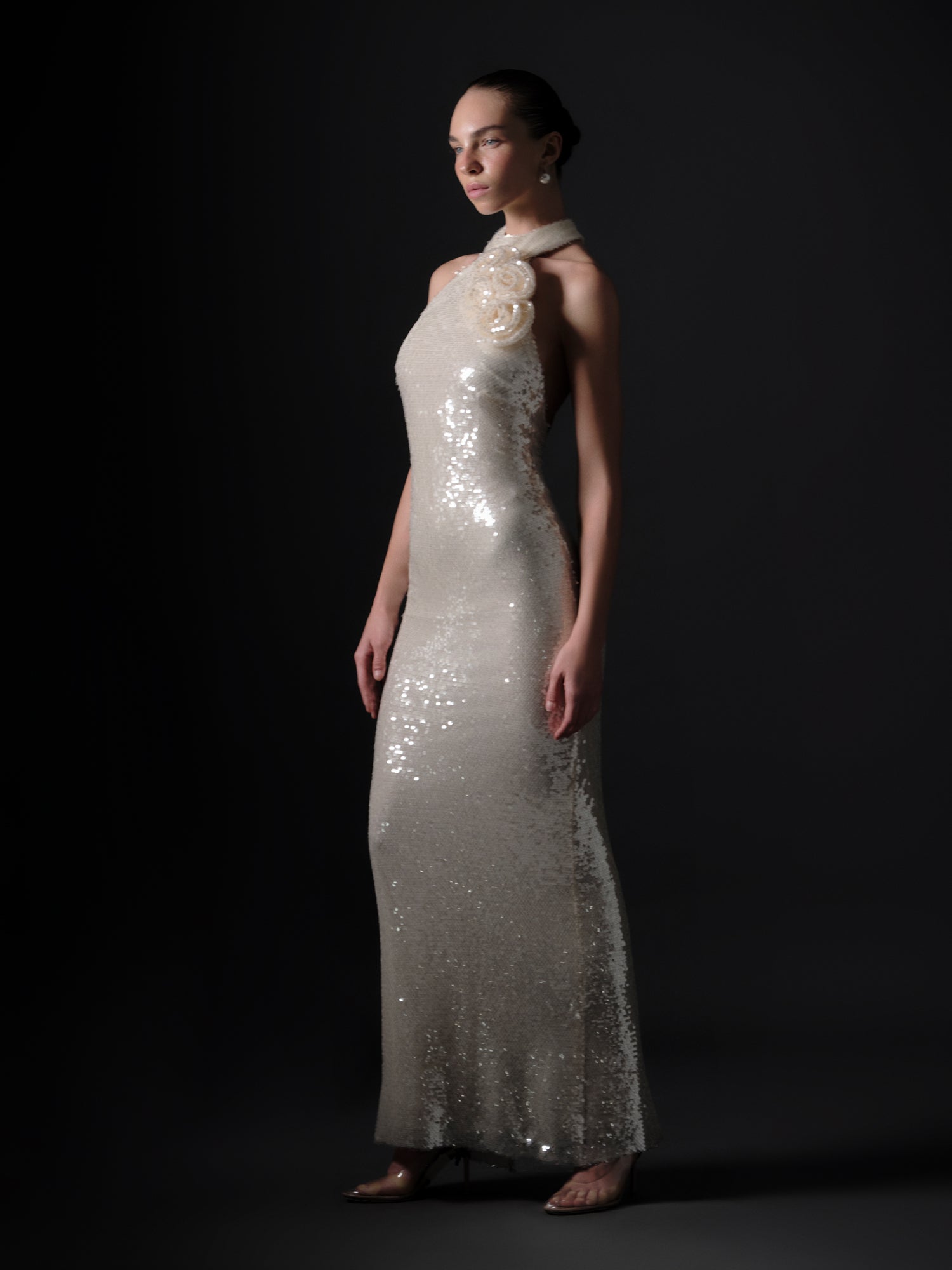 As the final piece of the CALICE No. 8 collection, the Révélation Finale Dress symbolizes the graceful emergence of light through its one-shoulder silhouette and shimmering sequin surface.