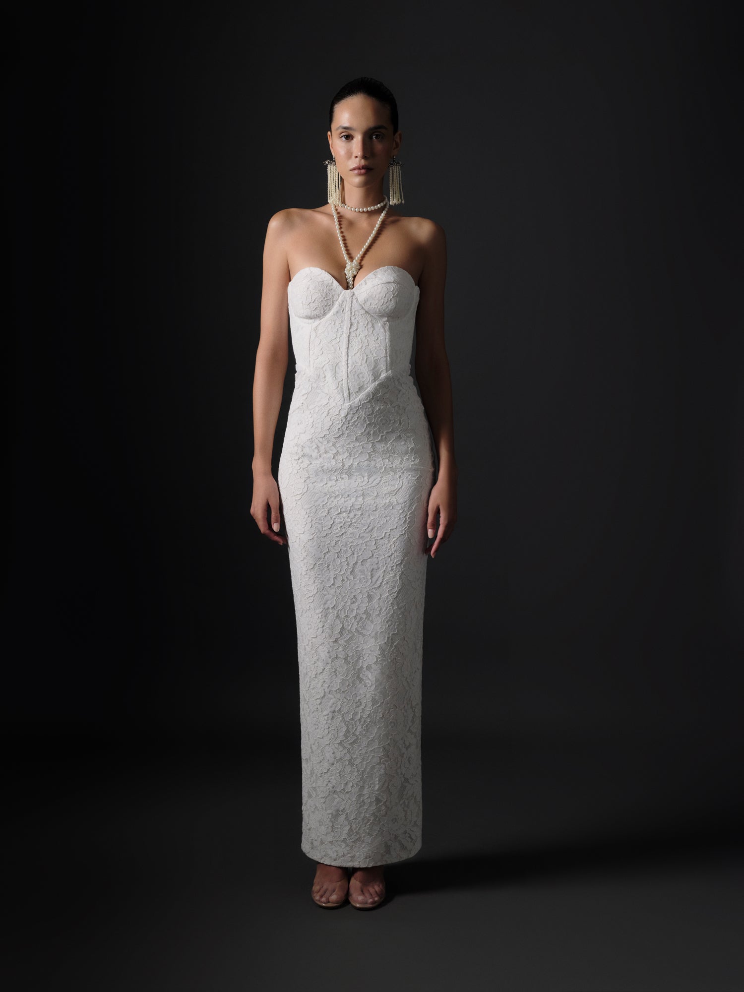A timeless expression of bridal elegance, the Serment Blanc Dress offers a classic yet powerful presence with its clean silhouette and delicate lace texture.