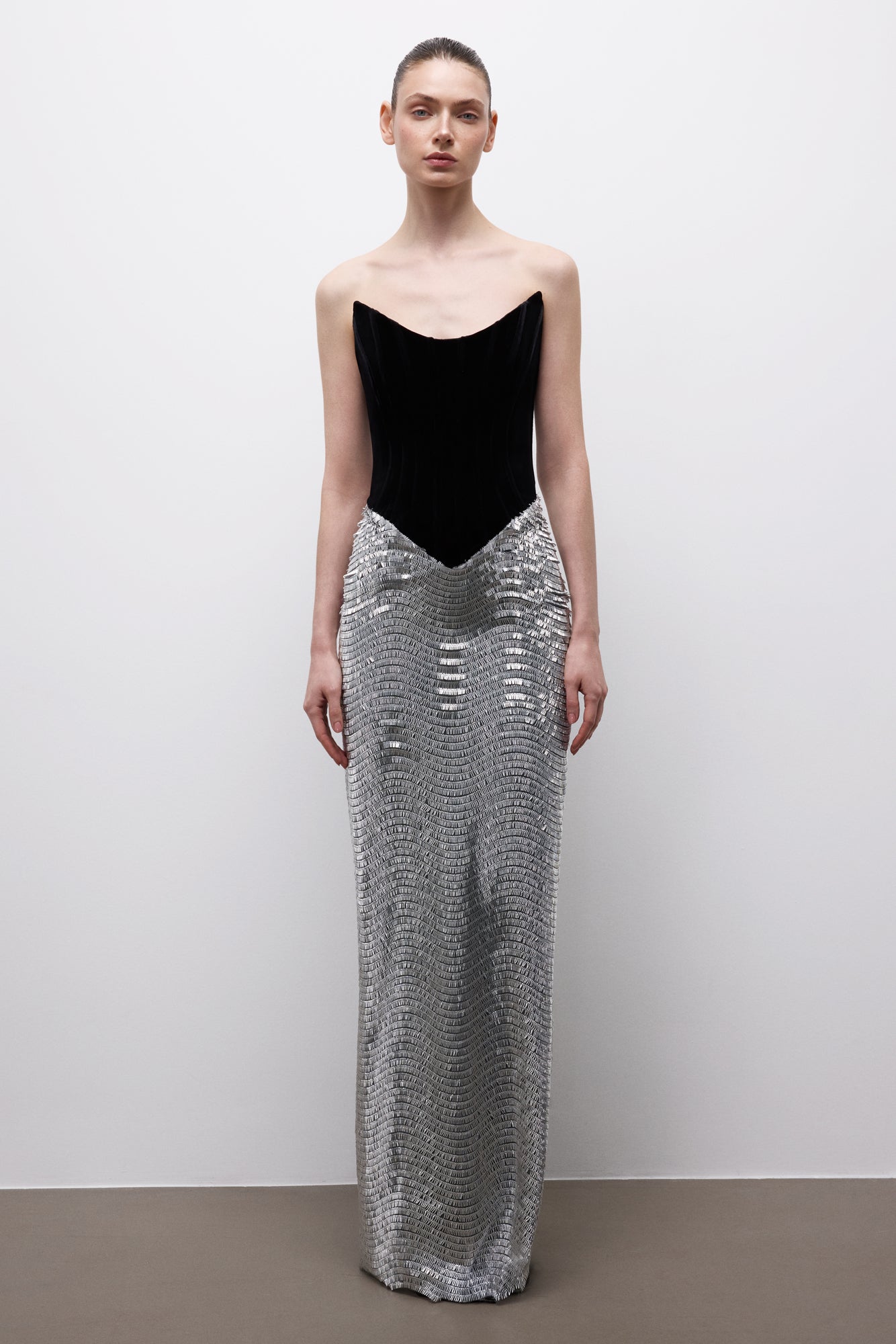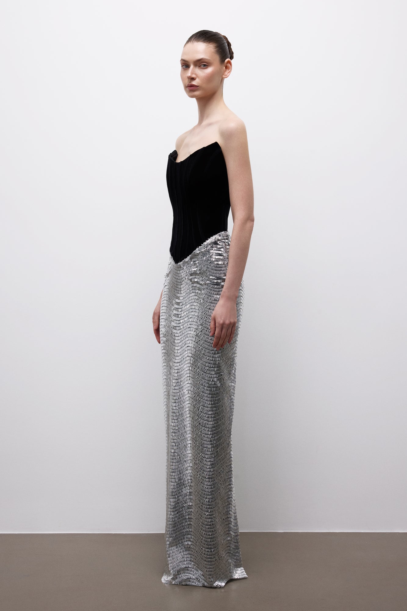 A strong contrast between a strapless corset bodice and a metallic-textured skirt.