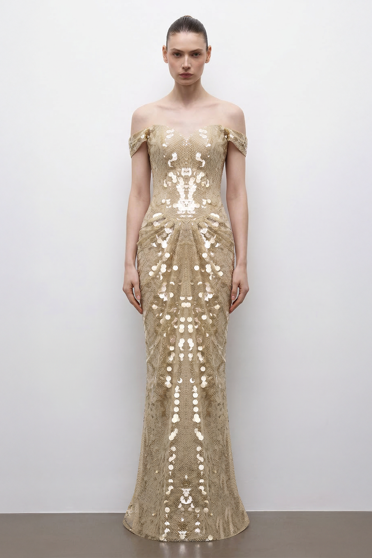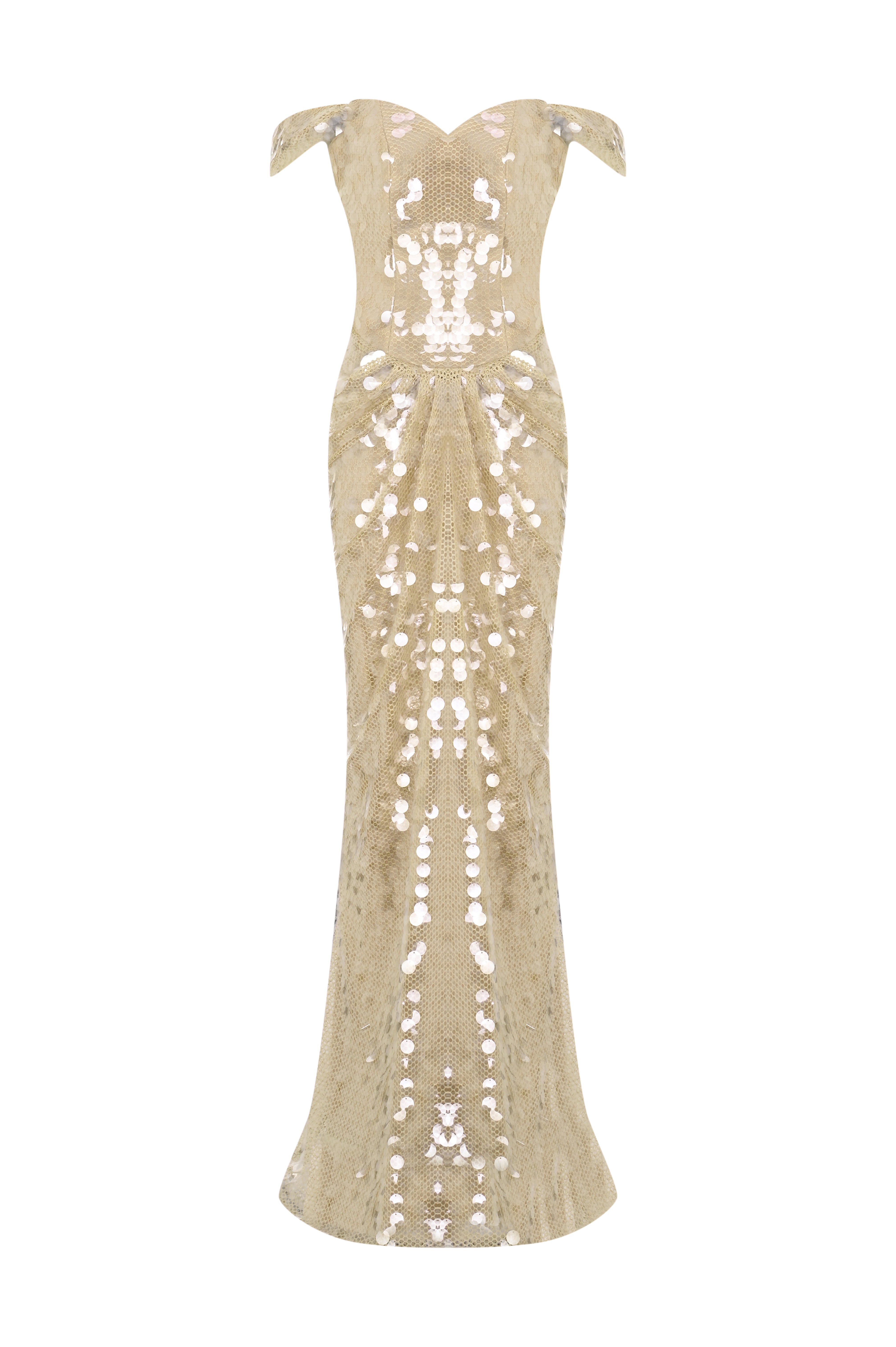 Soléa Corset Dress is a couture design where light meets structure with precision. Its corset-structured bodice sculpts the body into a statuesque silhouette, while the imported sequin surface creates a controlled and sophisticated shimmer with every step.