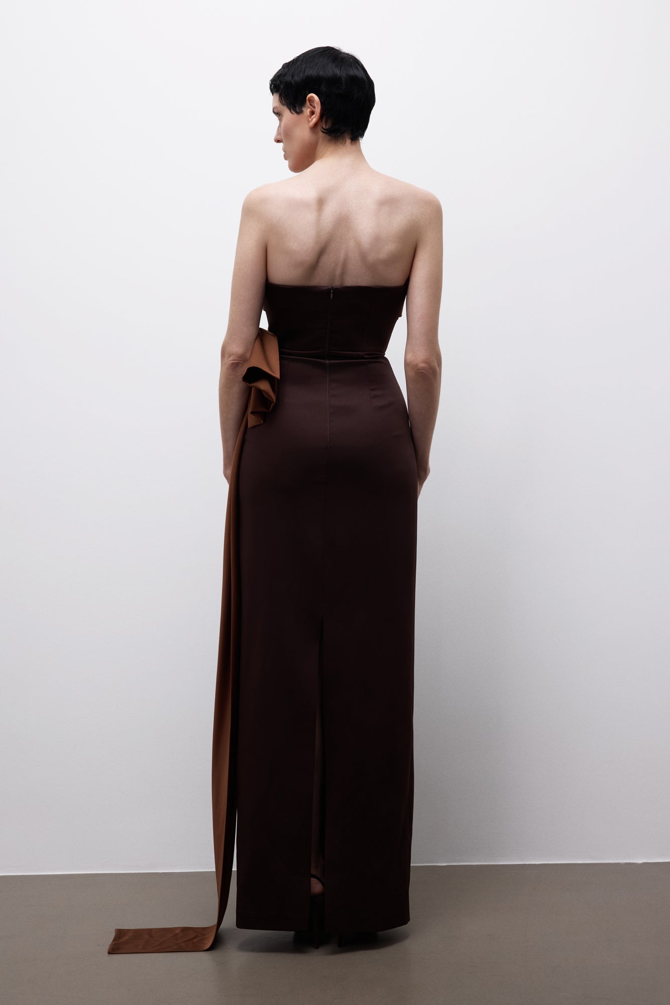 A strong strapless silhouette with a layered band form and an asymmetric strap detail.