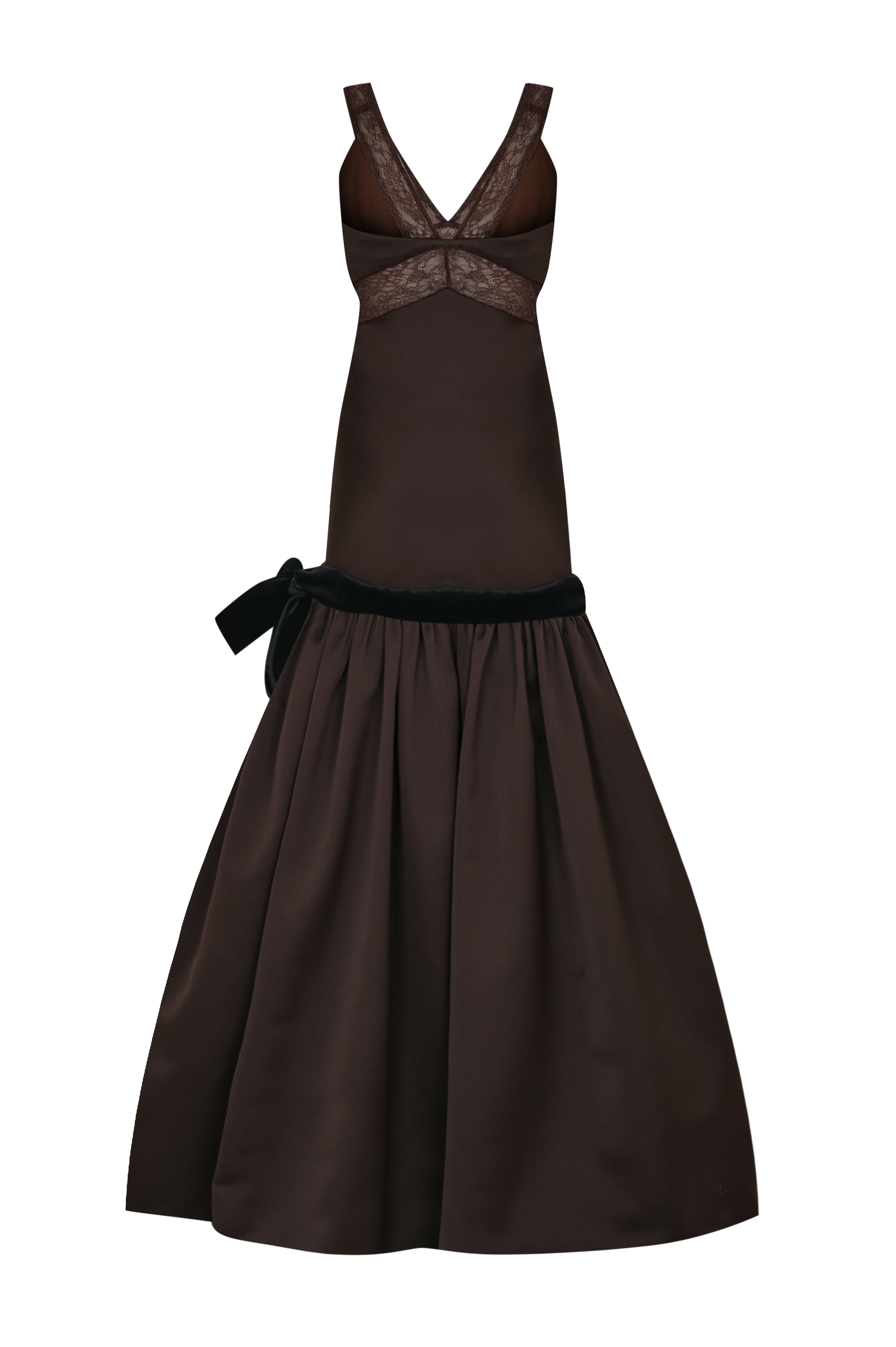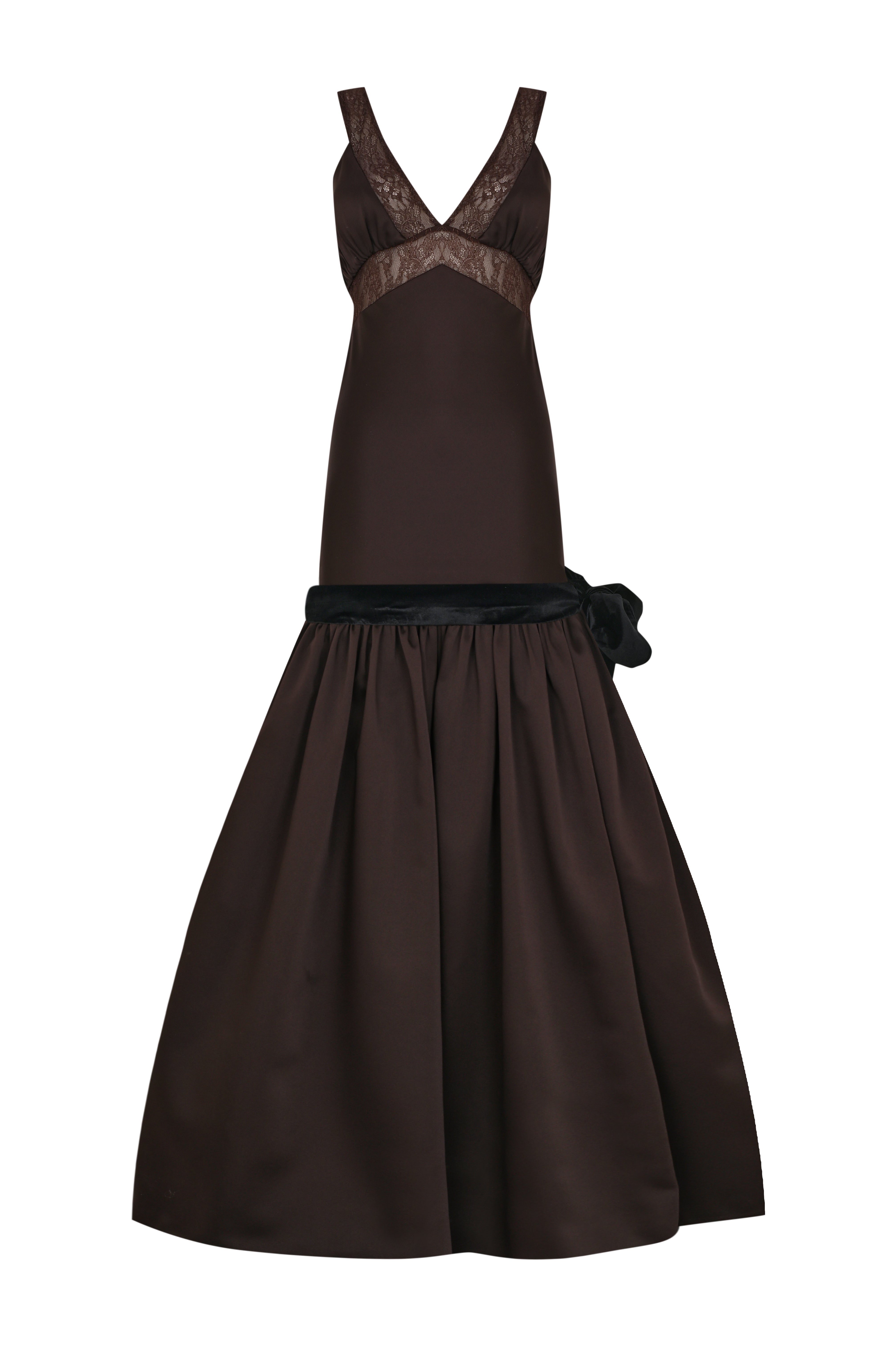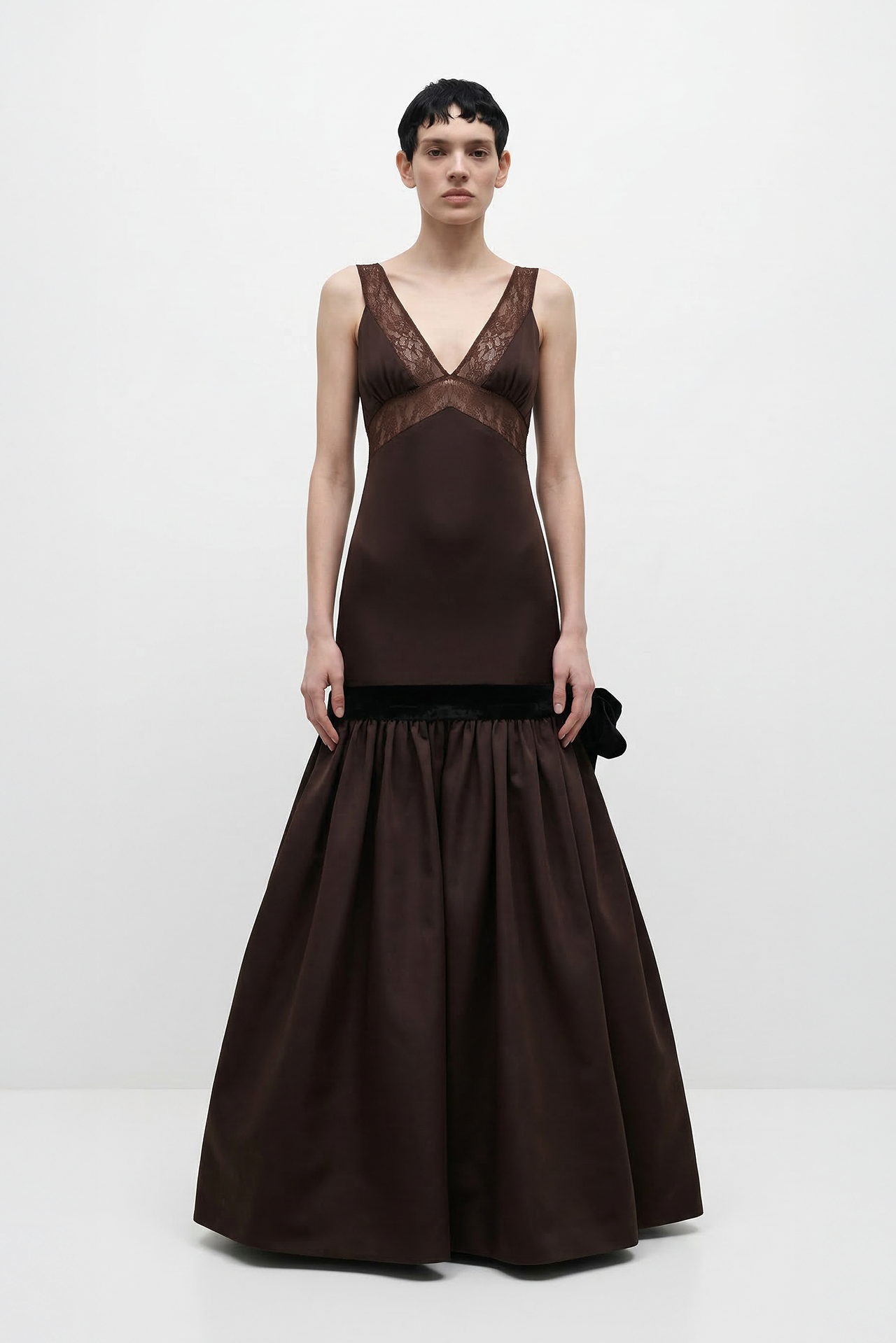 The Valerienne Dress reflects modern elegance through its minimal upper silhouette and voluminous gathered skirt. The high neckline and long sleeves introduce a clean and refined aesthetic, while the skirt softly expands from the waist to create a balanced and fluid form.