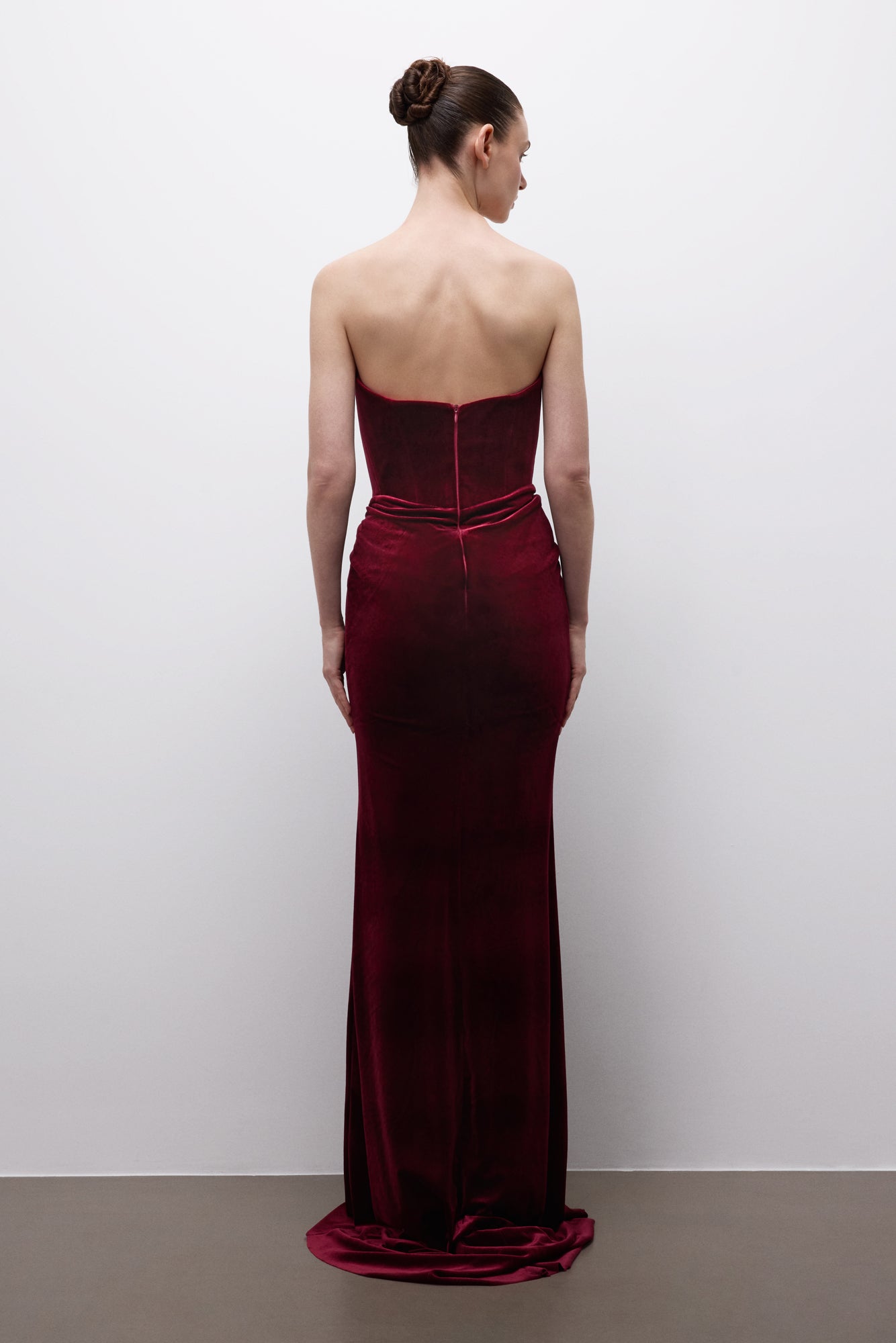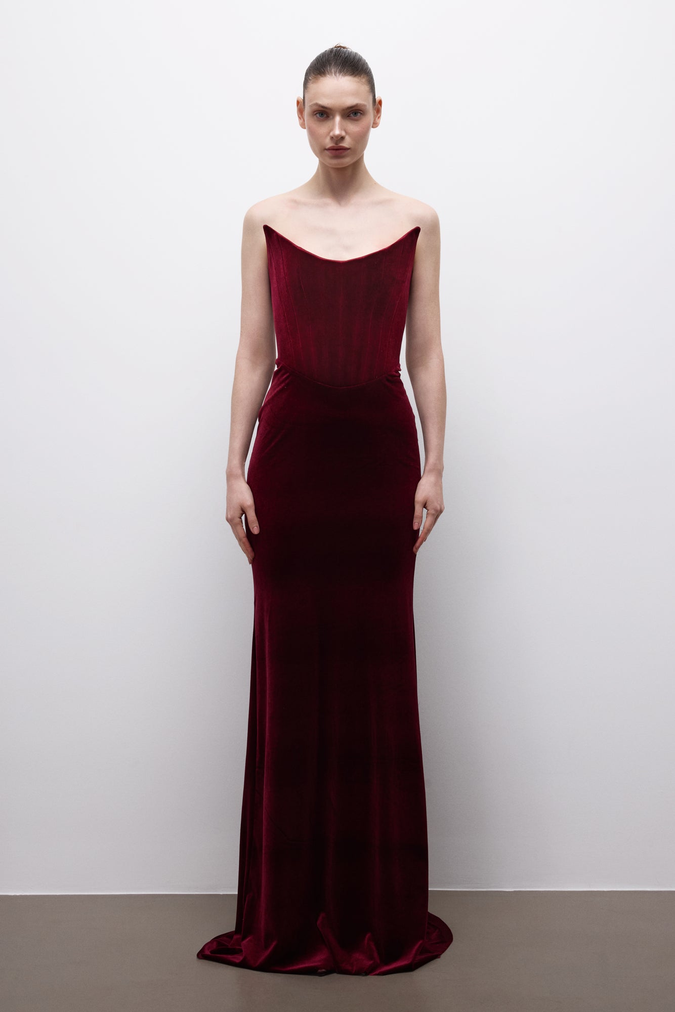 Virelya Veil Dress draws its power from ancient night rituals and ceremonial silhouettes. Its sculptural corsetry wraps the body with silent authority, while deep burgundy velvet flows with controlled elegance—designed for a timeless, powerful stance.