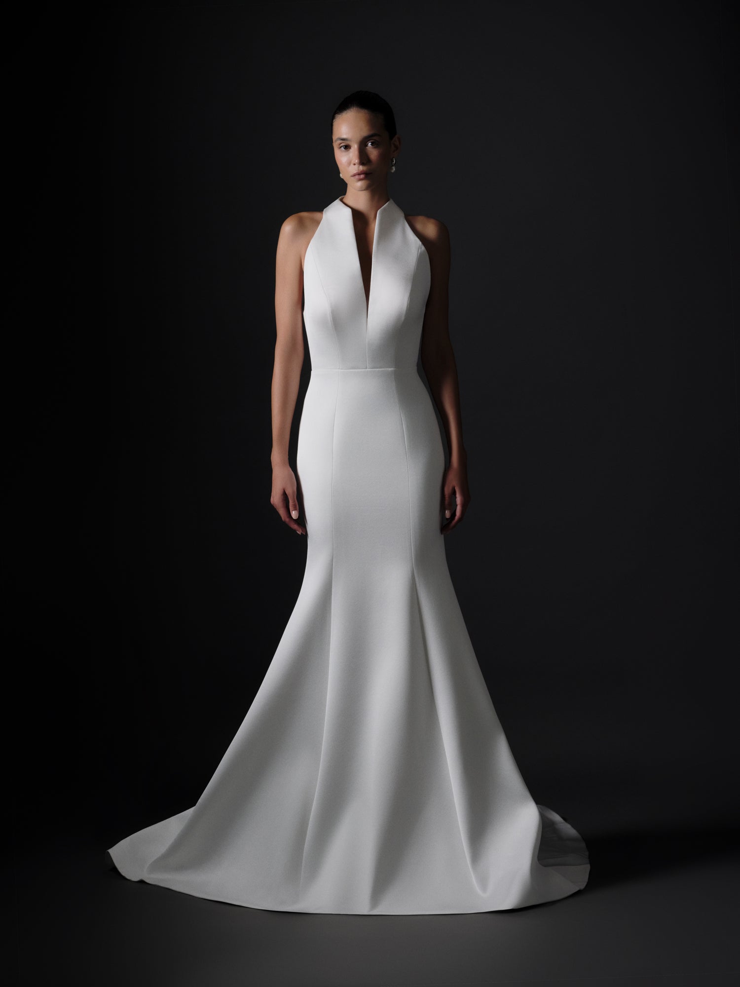 Designed with a philosophy of pure form, the Vœu Éternel Dress offers a timeless and powerful bridal presence through its deep V neckline and sculpted mermaid silhouette.